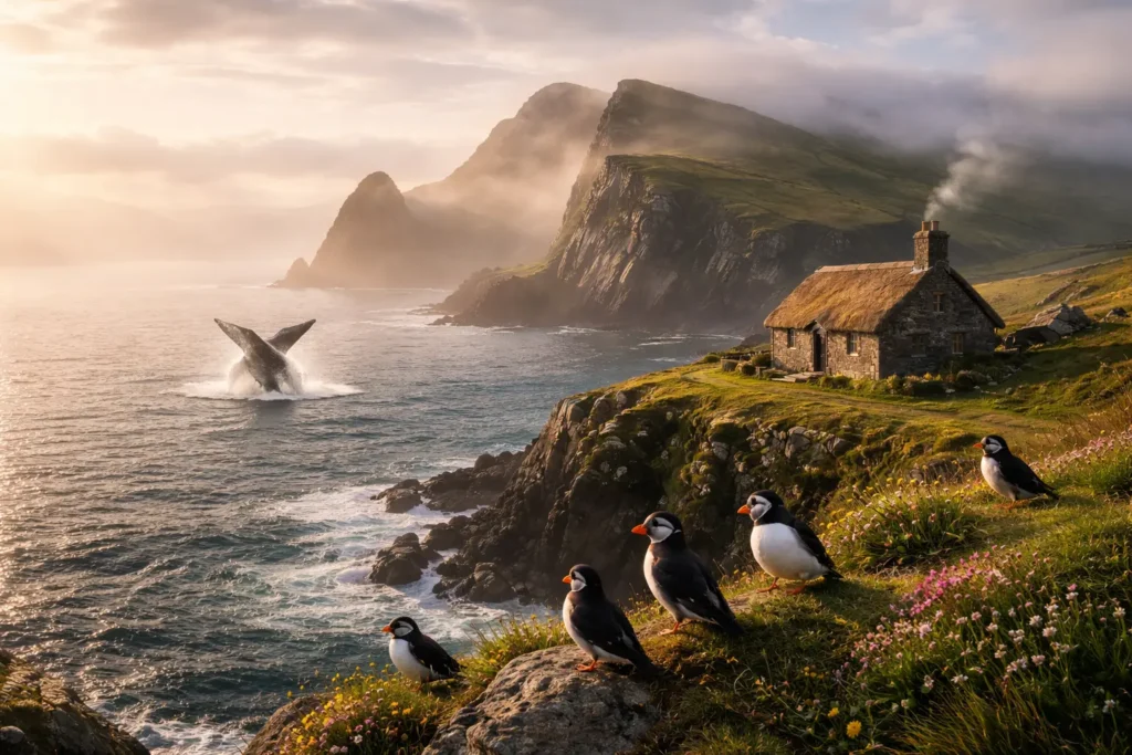 Puffins nest in burrows on steep coastal cliffs, and some Scottish islands host thousands of breeding pairs each year. Whale sightings are seasonal and depend on currents and food supply.