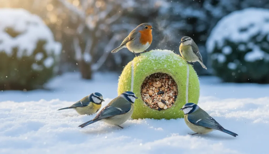 Use a halved or hollowed tennis ball as a lightweight feeder for small birds. The soft shell holds fat or seed crumbs and hangs under cover, protected from rain.